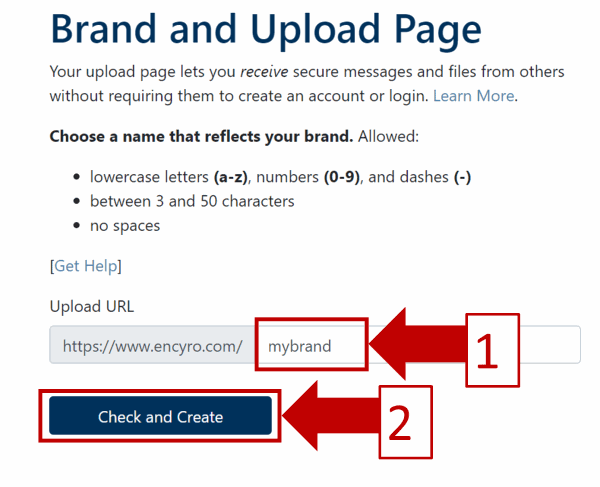- Find the text "Upload URL." In the input box that follows, type in a friendly name. You cannot use spaces or dots in the name. For instance, if your business or professional practice is called "XYZ Services LLC," you could try to choose a name like "xyzservices". Click "Check and Create" to set this web address. Your upload page address then becomes: https://www.encyro.com/xyzservices.